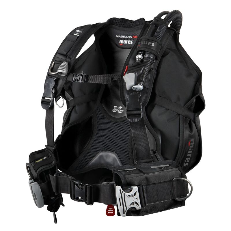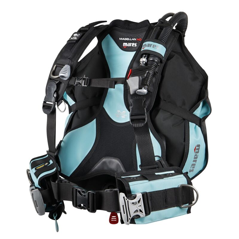 The Mares scuba BCD offers efficient back buoyancy with a 180 N lift, providing optimal support underwater. Experience enhanced comfort with X-tra cushioning on the backplate and a well-designed shoulder construction. The standard weight system, featuring two removable pockets, ensures customizable weight distribution. Practical features include knife grommets on the left pocket, elastic bands on the right for octopus security and integrated, removable Trim Weight pockets. Additional conveniences include a roll-down, zippered pocket on the right side and a dedicated sleeve for the optional Mares Titanium Line Cutter. With five stainless steel D-rings and color options in black, blue and aqua, the Mares Magellan HD scuba BCD is a reliable and versatile choice for divers.